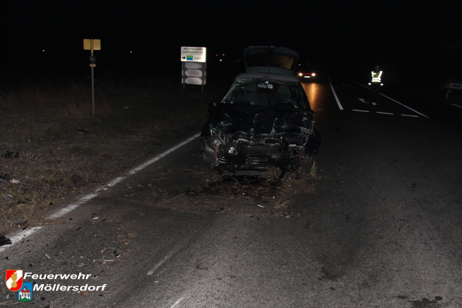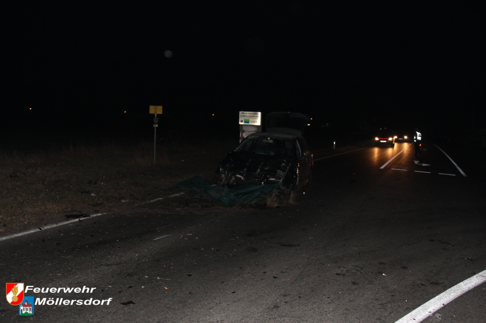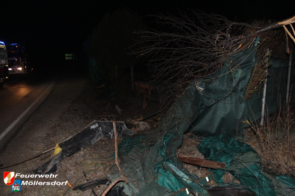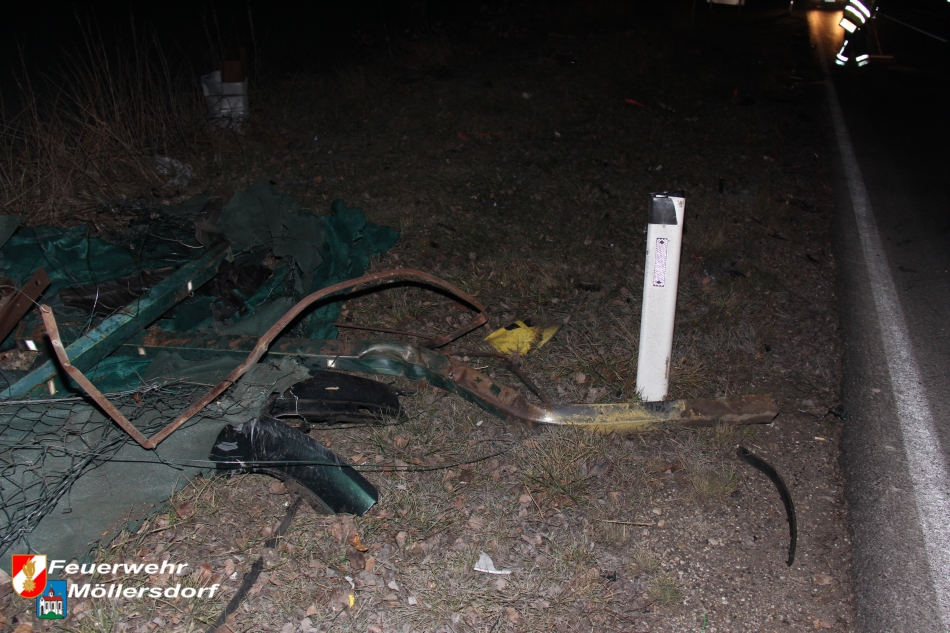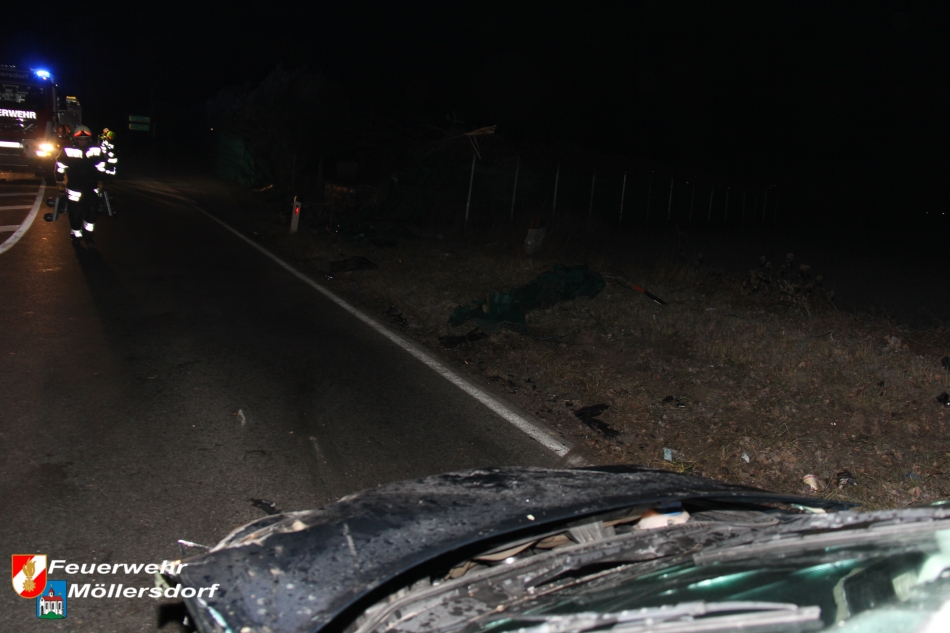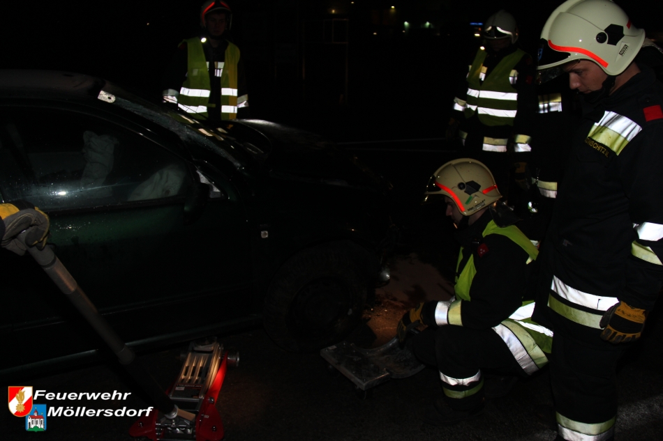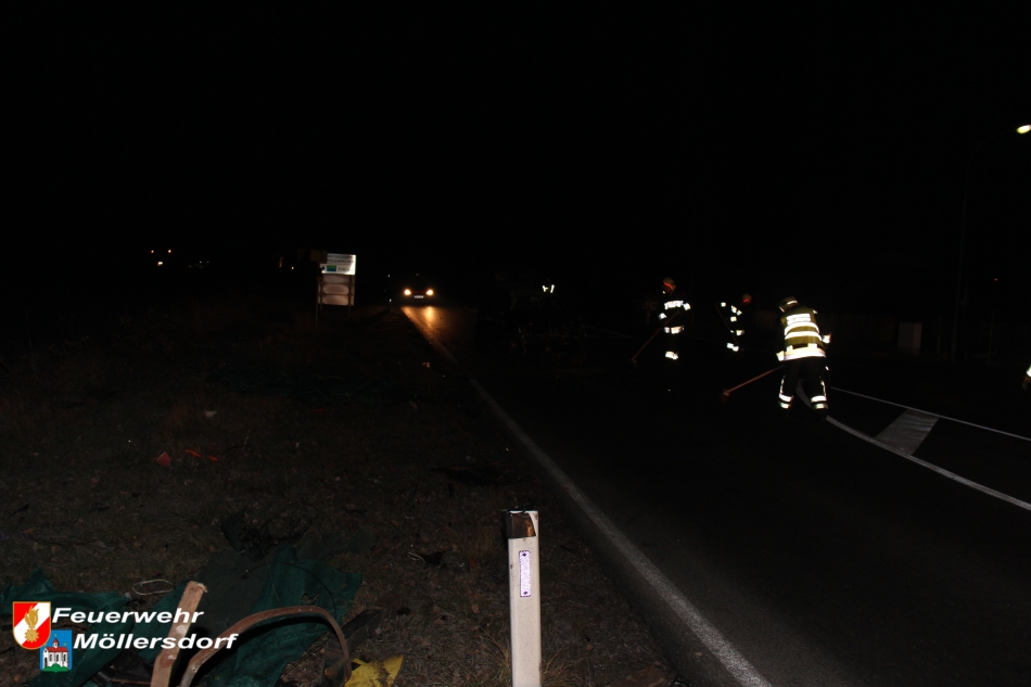 Beim Eintreffen der Feuerwehr war bereits die Straße durch eine Polizeistreife gesperrt. Die Feuerwehr Möllersdorf war mit dem Rüstlöschfahrzeug (RLFA) und dem Wechselladefahrzeug 1 mit Kran (WLFA1) vor Ort. Das verunfalllte Fahrzeug wurde an einer sicheren Stelle mittels Rangierroller verbracht und die Fahrbahn gereinigt. Nach ca 30 Minuten konnte wieder in das Feuerwehrhaus eingerückt werden und die Einsatzbereitschaft wiederhergestellt werden.