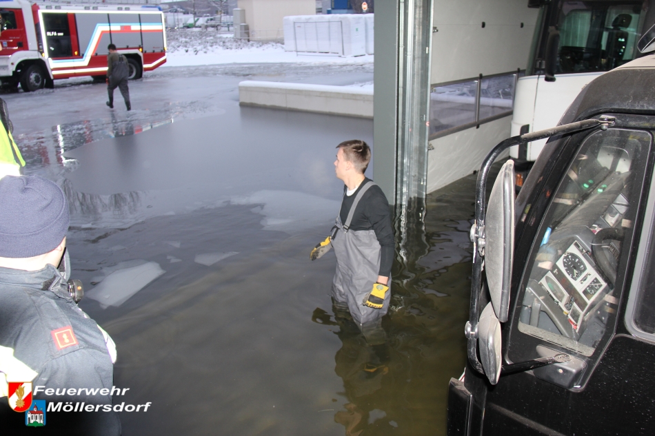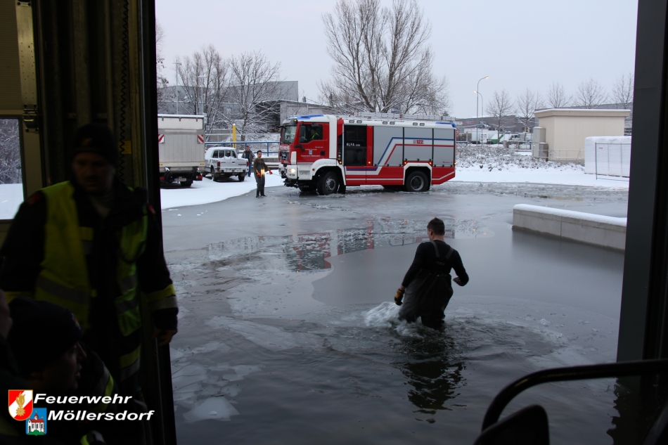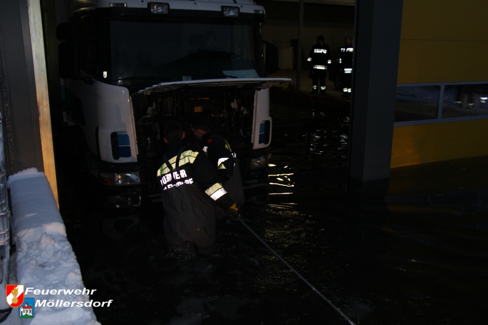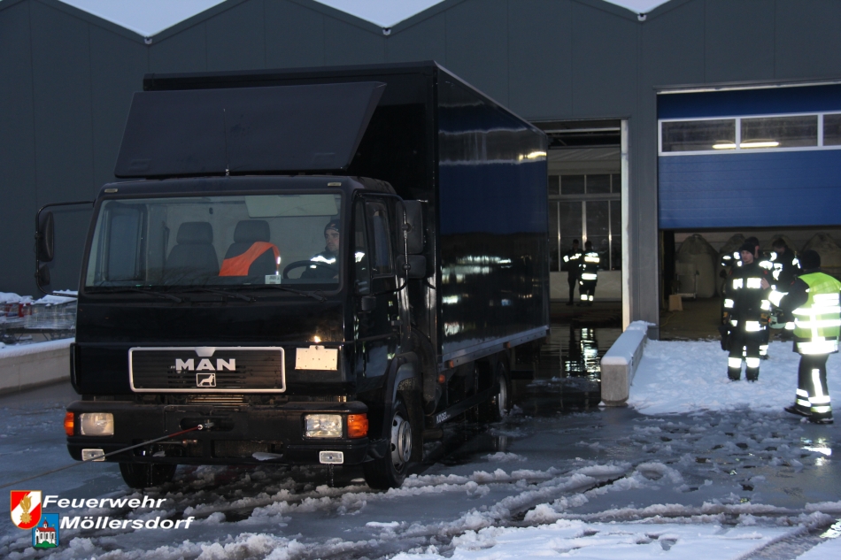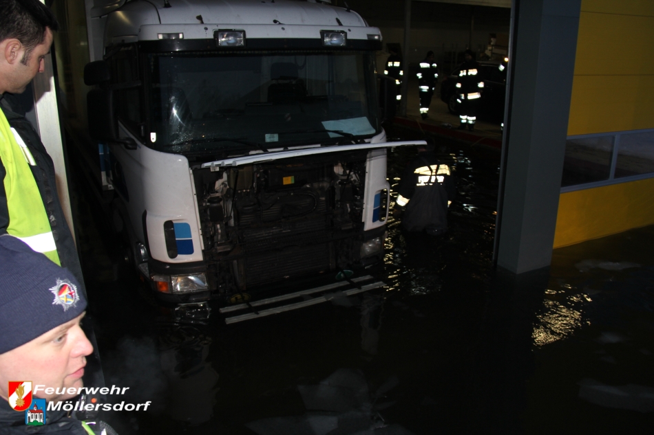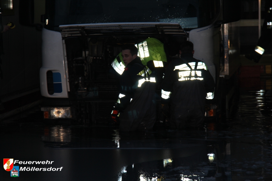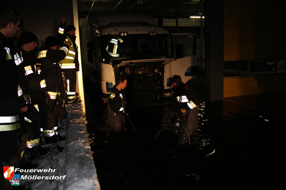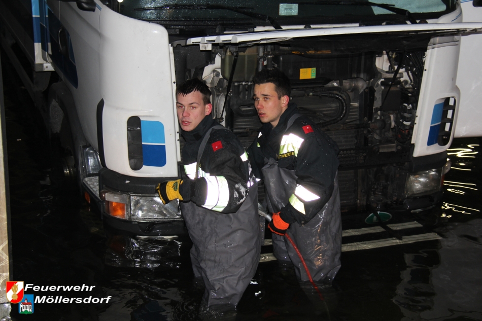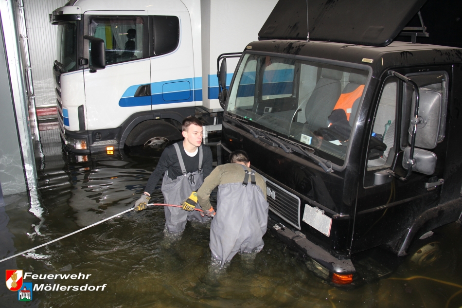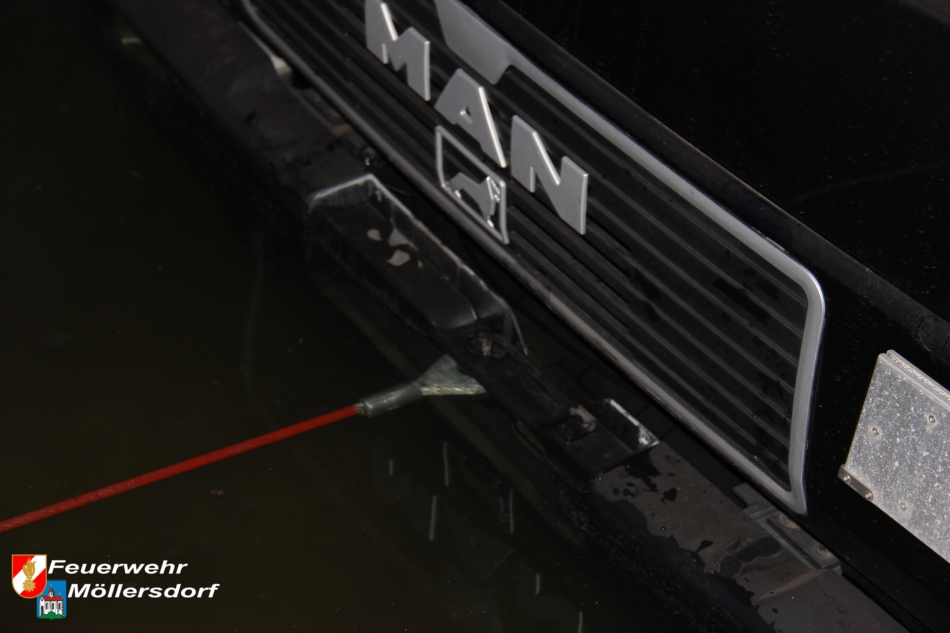Zwei LKW standen bis über die Räder im Wasser, konnten nicht gestartet werden und mussten durch die Feuerwehr geborgen werden. Mittels der Seilwinde des Rüstlöschfahrzeuges (RLFA) wurden beide Fahrzeuge auf den Fahrzeugabstellplatz gezogen.