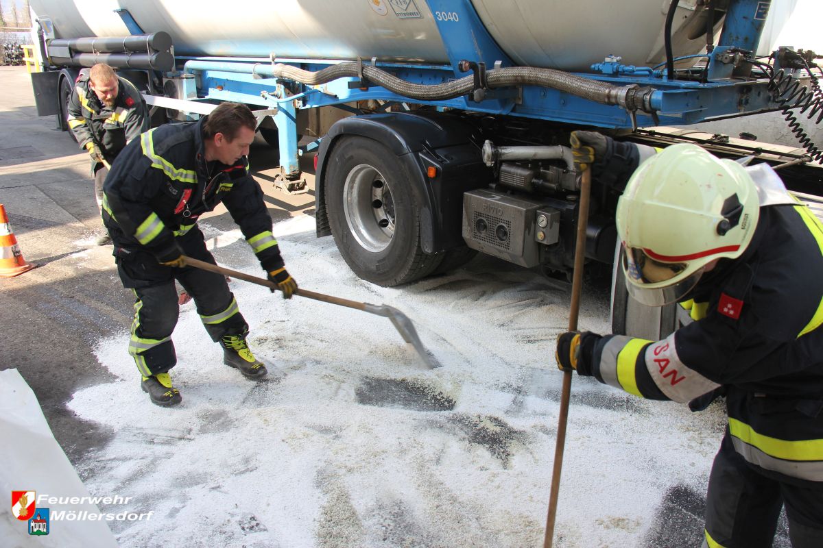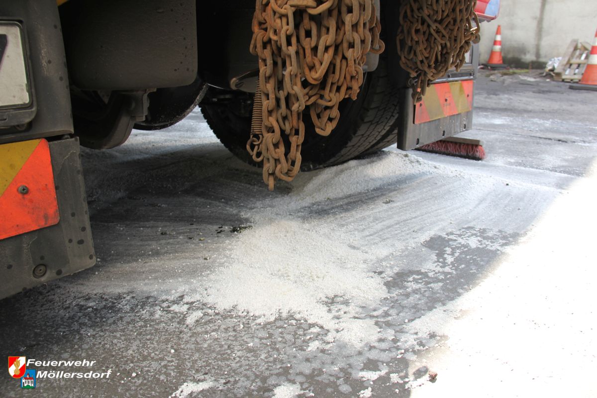 Weiters traf dann auch das Versorgungsfahrzeug (VF) mit mehreren Säcken Ölbindemittel und der Wechsellader 2 mit Schadstoffcontainer (WLFA2-SSTF) am Einsatzort ein. Die Mannschaft begann somit das Ökoperl Ölbindemittel aufzubringen um eine weitere Ausbreitung und Versickern in den Untergrund zu verhindern.