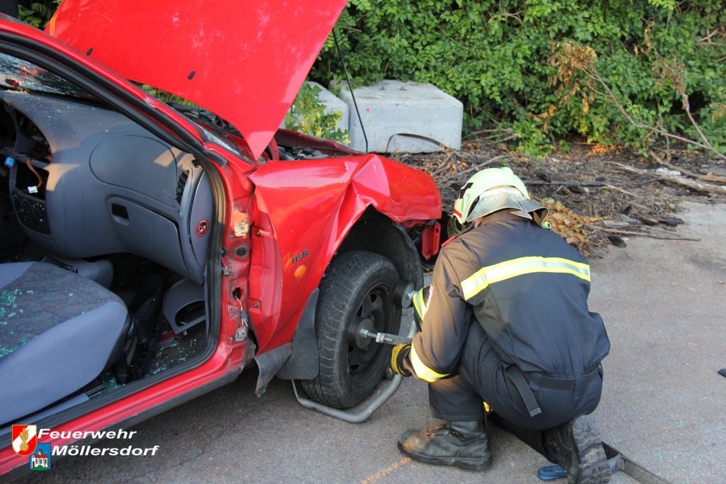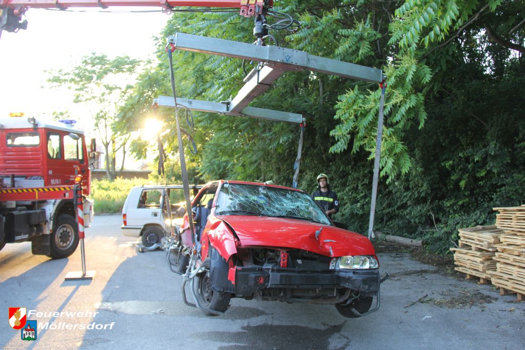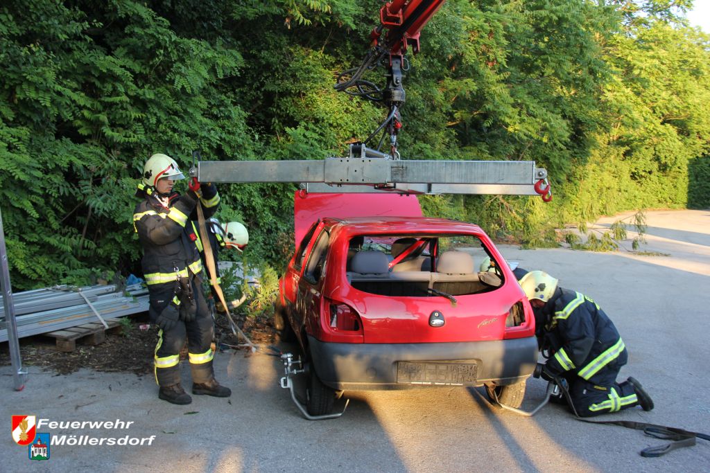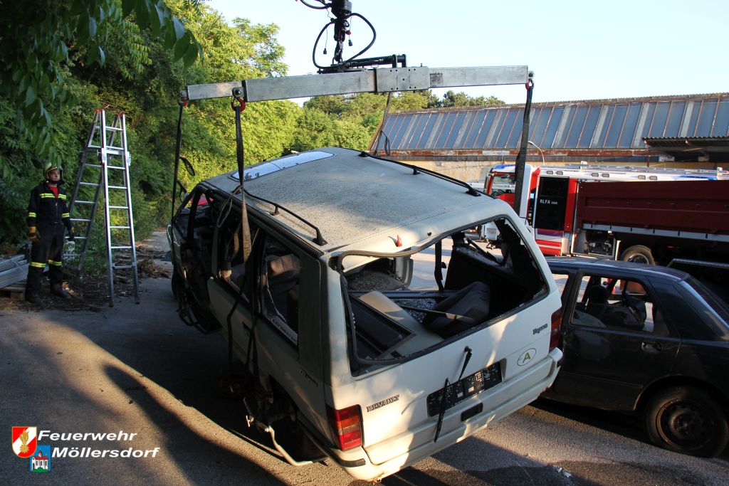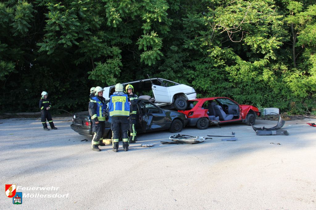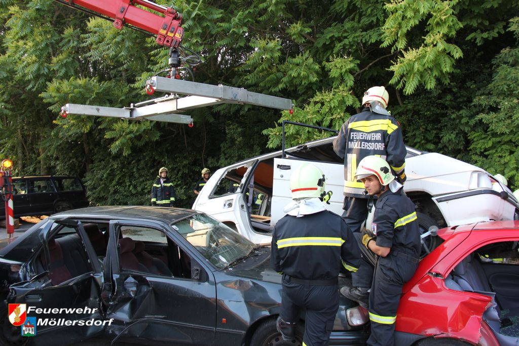 Somit war ein Großer Punkt erledigt, nämlich die Befreiung oder Versorgung von Verletzten am Unfallort. Die Straßensperre wurde durch das Kommandofahrzeug dargestellt und ein zweifacher Brandschutz wurde aufgebaut. Das etwas schwierigere bei diesem Einsatz war, dass ein PKW praktisch auf den ersten aufgefahren ist und mit den Vorderrädern im Kofferraum des 1. PKW befand. Zur Bergung wurde hierfür der Wechsellader 1 mit Kran und Hebekreuz eingesetzt. Weiters wurde ein PKW mittels Rangierroller vom Unfallort entfernt und verkehrssicher abgestellt.